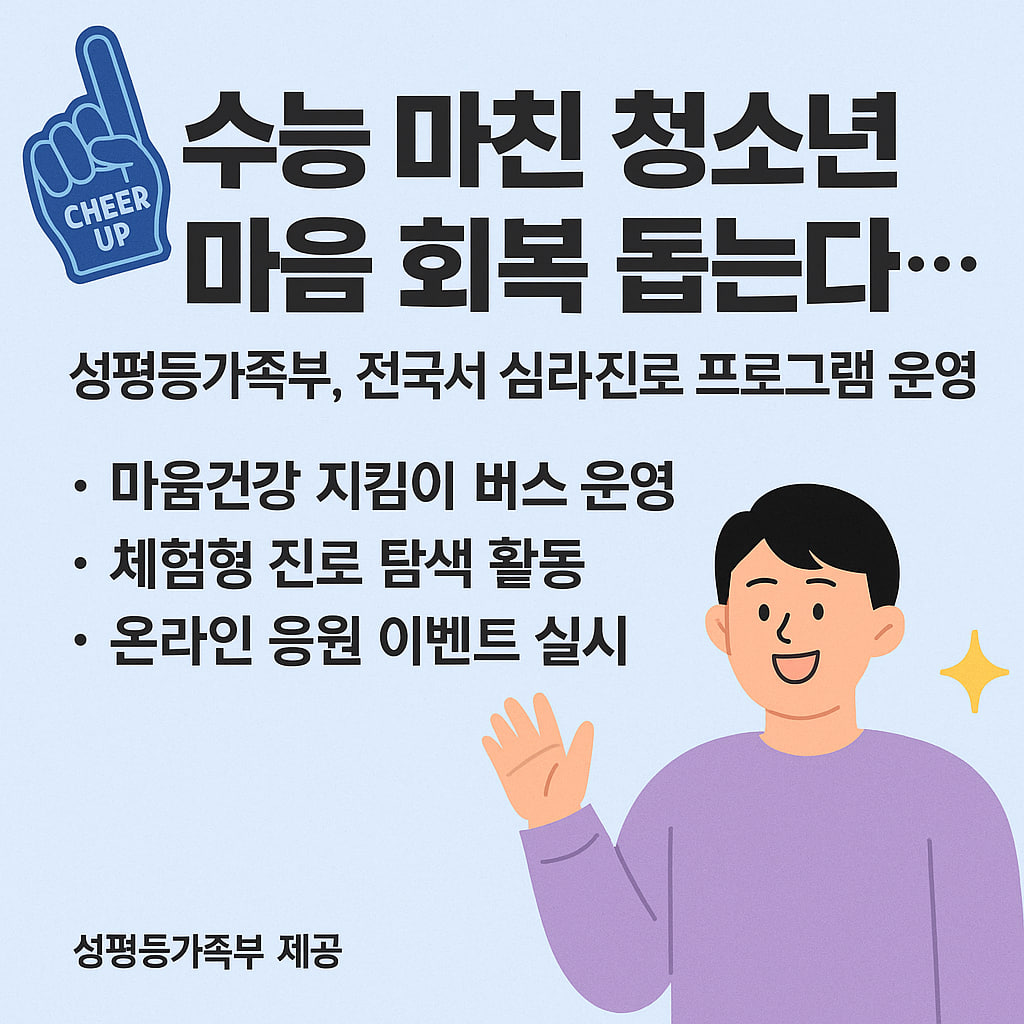 성평등가족부는 “수능을 치른 모든 청소년이 잠시 숨을 고르며 자신의 마음을 돌보고, 다음 단계를 준비하는 시간이 되길 바란다”며 앞으로도 청소년 마음건강과 진로 지원 정책을 지속적으로 추진하겠다고 밝혔다.